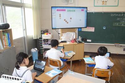 算数科では「10倍した数」について学習しました。25×10について、10円玉と5円玉を使って考えました。タブレットPCに自分の考えをかき込み、画面を共有して考えを伝え合いました。スタンプ機能で10円玉や5円玉を増やしたり、その絵にかき込んだりして、相手に分かりやすく表現しようという姿勢がよく分かりました。