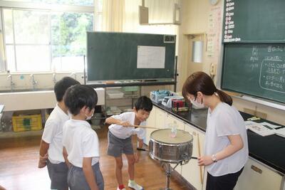 理科では、音の出方や伝わり方について学習しています。この日は、音の大きさによってものの震え方の違いを小太鼓を使って実験しました。震え方を可視化するために、小太鼓の上に小さいビーズを置き、その動きを調べました。音のふしぎを学習しています。