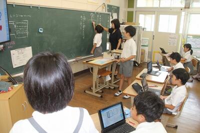 国語科では、詩を味わおうという学習を行いました。「わたしと小鳥とすずと」「夕日がせなかをおしてくる」を使って、感じたことや考えたことなどを出し合い、感じ方の違いについて学習しました。タブレットPCに自分の考えを書き込み、その後、考えの共有を行いました。学習リーダーが進め方に困ったとき、周りのみんなが支えてくれる3年生です。