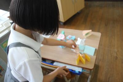 図工科では、紙を折るという仕組みから思いついたものを作る学習を行いました。紙を折ることで平面が立体となり、想像力が広がりました。また、折り目に合わせて形を変えたり色を変えたりして、作る楽しさを味わいました。