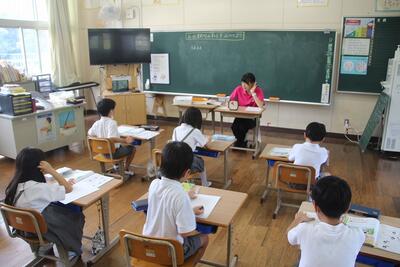 夏休みを前に平和学習を行いました。「トビウオのぼうやはびょうきです」という絵本の読み聞かせを行いました。核兵器廃絶と平和の尊さについて絵本から感じとりました。また、ALTのA先生が最後の勤務日だったので、みんなでお礼の言葉を伝えました。