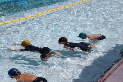 夏空が広がり、プールでの運動は最適です。動物になりきって、顔をつけたり潜ったり水に浮いたりなどの運動をしました。