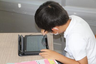 3年生はキーボードで入力する学習はまだなので、手書きソフトを使って指やタッチペンで文を書いていました。入力した文章は教室のモニターに表示させるので、先生のチェックがすぐに入りました。タブレットの画面を見つめる3年生のキラキラした目がとても印象的でした。