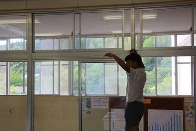 家庭科では、「すずしく快適に過ごす着方と手入れ」という単元の学習をしています。この日は、子どもたちが事前に準備した体育服やTシャツ・靴下などを洗濯しました。学校には干す場所が限られているので、家庭科室の中にロープを張って干しました。洗濯はほぼ毎日行うものなので、洗濯を毎日して支えてくれる人に感謝をしたいですね。