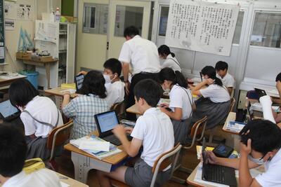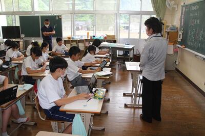 社会科では、私たちのくらしと憲法の学習をしています。この日は、学習のまとめとして自分が決めたテーマに沿って調べ学習をしました。国会のこと、法律のこと、少子化対策、防災対策などこれまで学習してきたものの中から自分で深掘りし、タブレットPCで発表資料を作成しました。東陽中学校のM先生にもアドバイスをもらい、活動しました。どんな発表になるのか楽しみです。