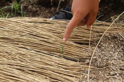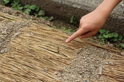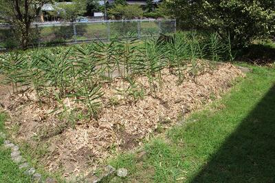 5月2日に6年生がたねショウガを植えてからちょうど1ヶ月。ついに、ショウガの芽が2つ出ました。