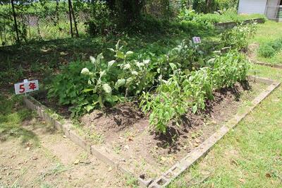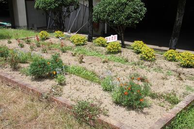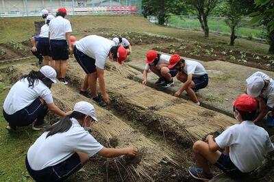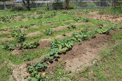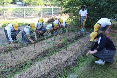 この日は6年生全員で草取りをしました。うねの横に生えている雑草を1本1本丁寧に抜きました。また、隣の畑には1ヶ月前に植えた安納芋の苗の周りに生えている雑草取りもしました。ショウガが順調に成長していることをCS委員の橋本さんに報告しようと思います。