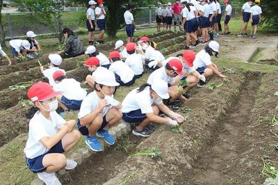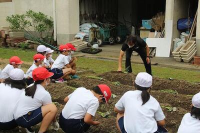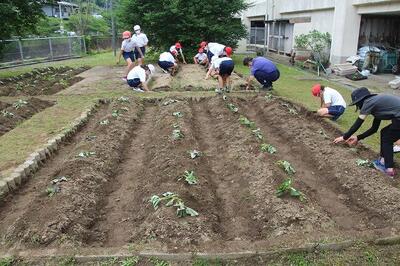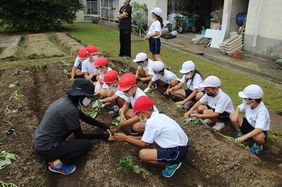 担当の先生から植え方の説明を聞き、学年ごとに植えました。1年生は初めての体験です。