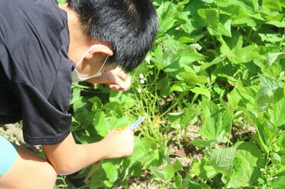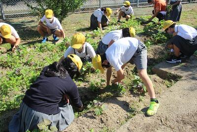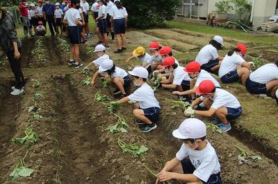 5分間自分のペースでランニングを行いました。走り終わった後、1年生は自分たちで植えた枝豆の草取りをしていました。汗をいっぱいかいた体で上手に草を抜いていました。