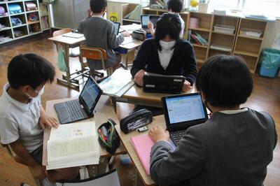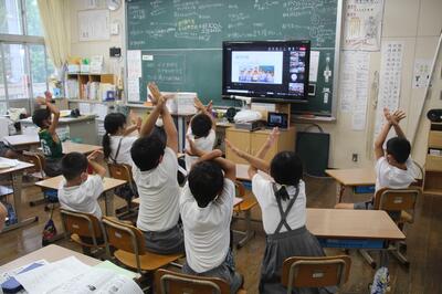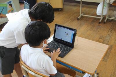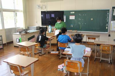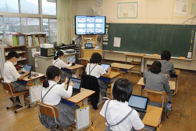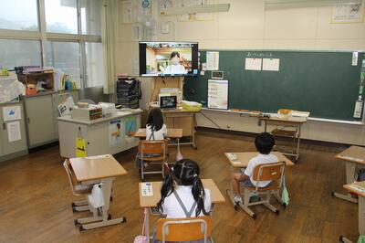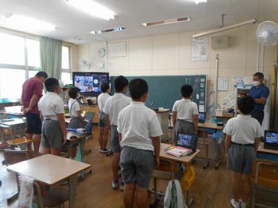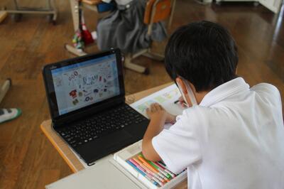 3年生から6年生まではタブレットを使った学習です。3・4年生はM社のコミュニケーションアプリを使ってビデオ会議をしていました。