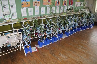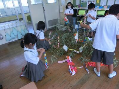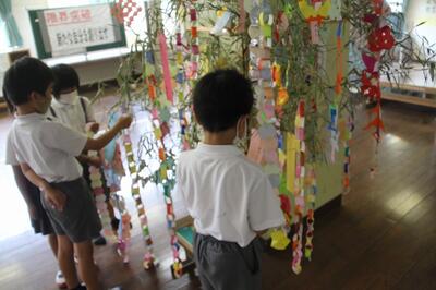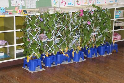 1・2年生教室の前を通ったら、「アサガオが咲いている!」「ミニトマトが赤くなっている!」というかわいい声が聞こえてきました。
