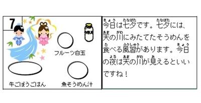この日の給食は、麦ご飯・すまし汁・きびなごのフライ・黒皮かぼちゃのうま煮・牛乳の「カルシウムたっぷりメニュー」でした。各クラスでは、給食時間に係の人がこのような掲示物を設置します。