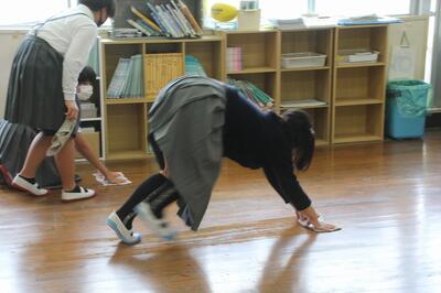 1・2年生は体育館でマット運動遊びを行いました。じゃんけんなどを取り入れ、ゲーム感覚で腕を使って体を支える運動遊びを楽しんでいました。