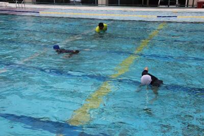 次は、3~6年生です。1・2年生と同じように体育館で諸注意や準備運動を行いました。その後、水慣れをして、水中じゃんけんや水に潜るゲームなどをして楽しみました。