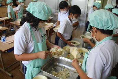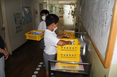 給食の時間を紹介します。校舎のすぐ隣に給食センターがあり、子供たちは上靴のまま行くことができます。そこで、いただきますのあいさつをして、食器や食管などを受け取ります。階段はありますが高学年の教室からは近い場所です。2年生が一番遠い場所になります。みんなで役割を分担して、食べる準備をします。いつもあつあつのおいしい給食を食べています。東陽っ子は恵まれています。