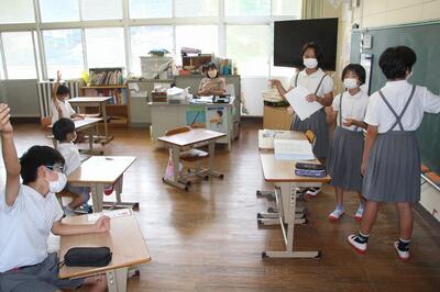 3・4年生は、特別の教科道徳の学習で、自分の考えを記入した後、みんなで共有し、よかった友達の考えを発表していました。