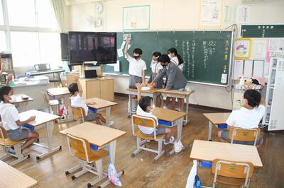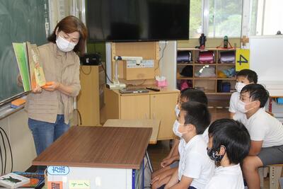 1年生は国語科「おおきなかぶ」の学習でした。登場人物のまねをしたり、言葉を出し合ったりして、「おおきなかぶ」の世界に入っていました。