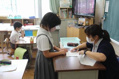 1年生は、生活科の学習でタブレットで撮影したアサガオの写真を見て、観察シートに記入していました。