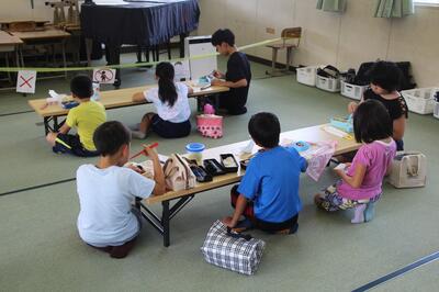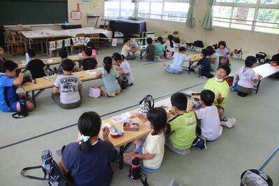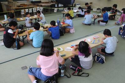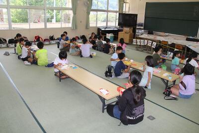 この日は4年生以上が行うクラブ活動がありました。3つのクラブがあるのですが、パソコンクラブはしおりづくり、総合スポーツクラブと昔遊びクラブが合同でソフトバレーボールを行いました。しおりづくりでは、インターネットを活用してしおりに合うイラストを取り入れ、印刷をして端を切り、ラミネートをかけてできあがりでした。合同でのソフトバレーボールでは6年生の動きがすばらしく、4・5年生はそれを手本に声を出してチームプレーをしていました。どちらも学年の枠を超えて笑顔いっぱいで活動していました。