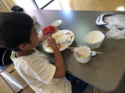 2年生から赤いミニトマトをもらいました。給食の時間に食べたら、とても甘くおいしかったです。アサガオやミニトマトを育てている1・2年生の成長を感じる今日この頃です。