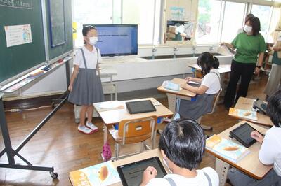 5・6年生は、タブレット端末を活用した授業を積極的に行っていました。5年の国語科の授業ではデジタル教科書を活用して新出漢字の学習をしていました。