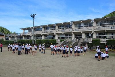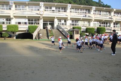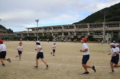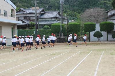 この日は朝から蒸し暑かったのですが、東陽っ子は元気に朝の活動に参加しました。ラジオ体操、健康観察後に、5分間のランニングタイムを行いました。