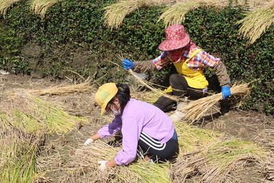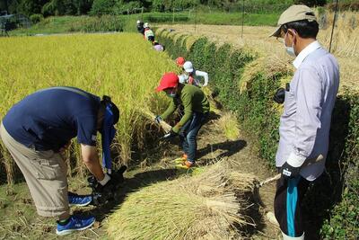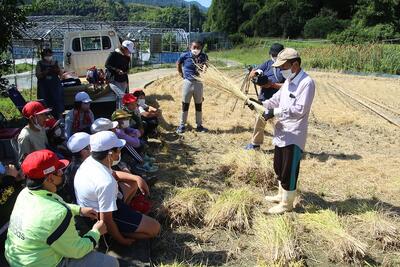 6月8日に田植えをしてから約4ヶ月、台風の影響をあまり受けることなく、稲が立派に生長し、稲刈りを迎えることができました。CS委員の橋本さんご夫妻にかまの使い方や稲の束ね方などを指導してもらい、作業を始めました。かまで切ったり稲わらでたばねたりなど初めて経験することばかりでしたが、5年生はがんばっていました。CS委員の橋本さんご夫妻をはじめ関係者の皆さん、貴重な体験をさせていただき、ありがとうございました。