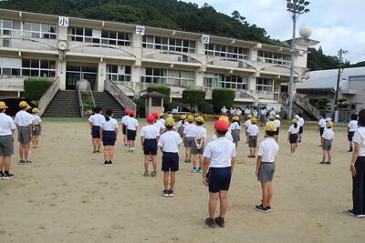 先生や体育係の指示のもと、教室や廊下でラジオ体操を行っていました。教室には冷房が入っているので、子どもたちは快適な環境の中で行うことができました。子どもたちがいない運動場は寂しい感じがします。