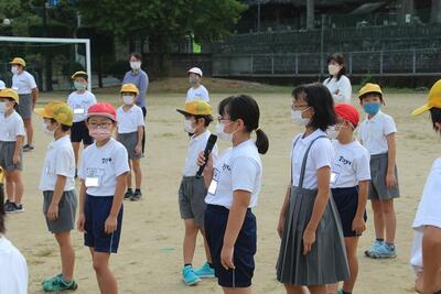 本校では「やまびこの集い」と言っている児童集会を行いました。通常は体育館で行っていますが、感染症対策として運動場で行いました。運営委員会から先月の生活目標の振り返りと、今月の生活目標についての発表がありました。感想発表では全校児童の前で堂々と自分の振り返りや目標を伝える人が高学年を中心にたくさんいました。すこやか委員会からは、トイレのスリッパ並べやお弁当の日の取組について発表がありました。その後、来週5年生が集団宿泊教室に行っていないので、その場合の登校班の確認作業を行いました。運動場でも聞く態度がステキな東陽っ子です。