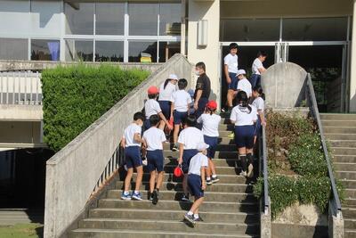 本校区は広いので、遠くから通ってくる児童の中には、車で送ってもらう場合があります。その際役に立つのがピロティー(校舎下の半地下の駐車場)です。