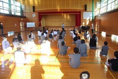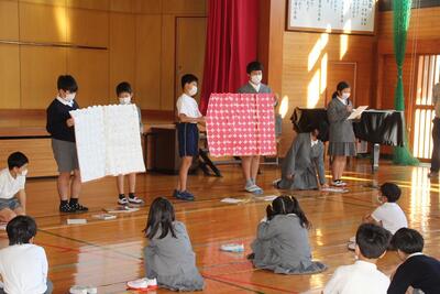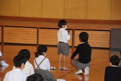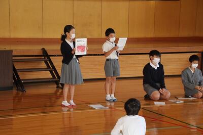 やまびこの集い(児童集会)を行いました。前回は感染防止対策のため運動場で行いましたが、今回は体育館で行いました。環境委員会から図書の紹介と読書週間の取組についての発表でした。発表後に、フロアの児童から感想発表がありました。多くの人が手を挙げ、自分の感想を伝えてくれました。伝え合うことの大切さを考えて取り組んでいます。