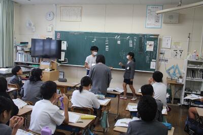 外国語では、東陽中学校のN先生と一緒に学習をしました。M先生から疑問詞の歌を教えてもらい、歌いながら楽しく疑問詞について理解することができました。歌の最後の「イェイ」がとても楽しく盛り上がりました。N先生、ありがとうございました。