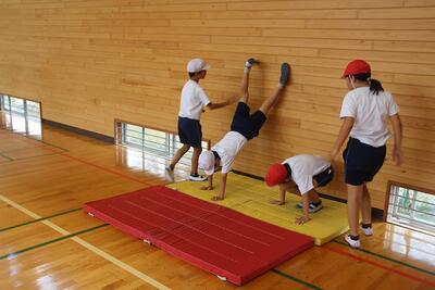 体育科では、マット運動に取り組んでいます。前転・後転・倒立系の運動を行い、この日は側方倒立回転を学習しました。逆さ感覚や腕支持の動きづくりを身に付けるために、壁登り倒立やとびばこを使った運動を行いました。腕や足が伸びた側方倒立回転になるように、ゴム紐を使って高さを意識した動きを考えました。授業の終わりでは、学習リーダーが進行役となって、自分や友達のよかったことを伝え合いました。みんなで上手になっている3年生です。