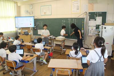 社会科では、「はたらく人とわたしたちのくらし」という学習をしています。この日は、農家の仕事の中でみかんを栽培されている保護者を取材した児童の発表を行いました。タブレットPCで撮影したみかんを選別する様子の動画をみんなに見せてくれました。仕事の様子がよく分かりました。