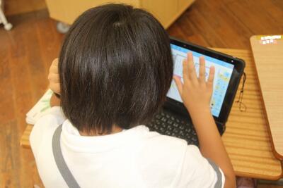 算数科では、小数のたし算やひき算について学習しています。「0.8-0.2」について、0.1がいくつ分あるのか整数に置き換えて考えました。タブレットPCに入力し、みんなの考えを共有して正解を探しました。情報共有アプリの使い方に慣れて、自分たちの力で進める3年生です。