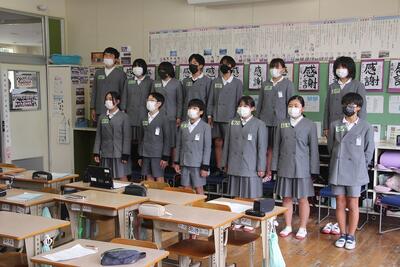退任式を行いました。6人の先生方とお別れしました。校長先生の紹介の後、転出する先生のお別れの言葉がありました。東陽っ子の中には涙を流している人がいて、お別れするのがとてもつらかったです。お別れする先生たちから「岬めぐり」の歌のプレゼントがあり、みんなで手拍子をして心を一つにしました。児童代表5年生のお礼の言葉と花束贈呈を行い、その後みんなで校歌を歌い、地域の上村さんに記念撮影をしてもらいました。お別れするのはとても寂しいですが、6人の先生方から教えていただいたことや楽しかった思い出を背負って、一歩前に踏み出しましょう。東陽小学校のために力を尽くしていただいた6人の先生方、ありがとうございました。