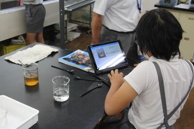 理科では、もののとけ方について学習しています。この日は、物が水に溶ける量には限りがあるか、食塩とミョウバンを使って実験を行いました。それぞれ5gずつ入れて、溶けたらさらに5gずつ入れていきました。タブレットPCを使って、溶けたことを撮影したり、実験結果を記録したりしました。