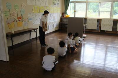 夏空が広がり、プールでの運動は最適です。動物になりきって、顔をつけたり潜ったり水に浮いたりなどの運動をしました。