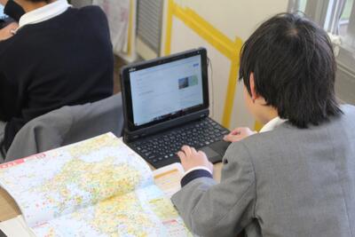 社会科では、市のうつりかわりについて学習しています。この日は、タブレットPCを使って、八代市の人口の変化を調べました。八代市全体の人口の変化や、八代市と合併する前の東陽村の人口を調べたりしました。これから八代市の様子や人々の生活の様子などについて、調べまとめる活動を行います。