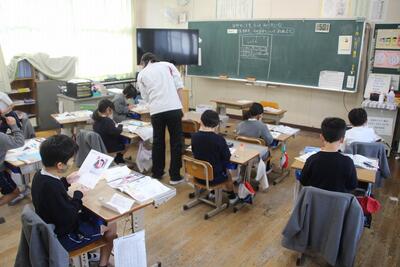 算数科では、100㎝をこえる長さの学習に入りました。この日は、両手を広げた長さを紙テープにとり、100㎝をこえる長さの測り方を考えていました。これから新しい長さの単位やその量感について学習していきます。
