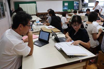 4月に実施した全国学力学習状況調査の結果を互いに報告し合い、分析・考察しながら、前回の結果と比較しました。