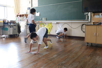 掃除の時間では、班で場所を割り振りし、異学年で協力しながら取り組みました。