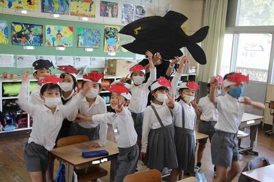 廊下を通りかかると2年生が盛り上がっていました。文化の祭典でステージ発表する音楽劇「スイミー」のお面をつけていました。大きなマグロもいて、すぐにでもステージ発表ができそうなほどでした。22日のビデオ撮影がとても楽しみです。
