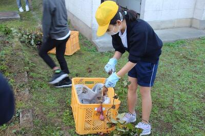 この日は全校児童で芋掘りをしました。6月1日に植えた安納芋を収穫しました。夏場に葉が虫に食われたり、つるが思うように生育しなかったりしたので、どのくらいの量が収穫できるか心配でした。例年と比較して収穫量が少なかったようですが、児童は収穫の喜びを体験することができました。収穫量を増やすために、品種や植え方・世話の仕方などを研究して、来年度につなげたいと思います。自然の恵みに感謝したいですね。