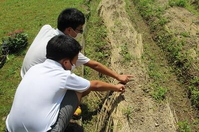 梅雨の晴れ間をねらって、ショウガ畑の草取りを6年生が行いました。ショウガは病気がはいると収穫ができなくなるとても配慮の必要な作物です。畑がぬれていると病気が入りやすくなるので、畑の表面が乾いているときに草取りを行う必要があります。晴天が続いたこの日に草取りを行いました。ショウガの芽がまっすぐ伸びて、大きく成長している様子をながめながら、草を丁寧に取り除きました。