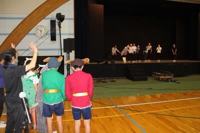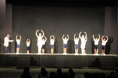 文化庁の舞台芸術等総合支援事業の学校巡回公演として神戸市の貞松・浜田バレエ団の皆様によるバレエ公演が東陽スポーツセンターで行われました。バレエを生で見る機会があまりないので、子どもたちはわくわくドキドキしていました。小学生が鑑賞しても飽きないように、いろいろな工夫がなされていました。前半は参加型のプログラム構成で、子どもたちにバレエの基本動作をしてもらったり、会場にいる人たちにも簡単な手の動きを行ってもらう取り組みがなされていました。また、前日のリハーサルから練習をしていた8人の子どもたちを「動物のカーニバル」にゾウ・イヌ・ネコ・ウサギで出演させていただきました。後半は、「白鳥の湖」や「日本バレエと祭」などのプログラムでバレエの美しさや楽しさ・力強さなど、見ている人を感動させるすばらしい公演でした。貴重な機会を与えてくださった、貞松・浜田バレエ団の皆様をはじめ関係者の皆様、ありがとうございました。