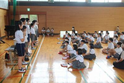 6月は、「歯を大切にしよう月間」と「食育月間」です。やまびこの集い(児童集会)では、すこやか委員会の発表と学校栄養職員のI先生からの話でした。すこやか委員会の発表では、クイズ形式による歯についての発表でした。よくかむことや歯を大切にすることなどが伝えられました。I先生からは、6月の食育の目標や給食についての話がありました。感想発表では、自分から進んで手を挙げ発表する東陽っ子がたくさんいました。自分の体を大切にすることが何よりも重要です。本校は健康教育にも力を入れています。