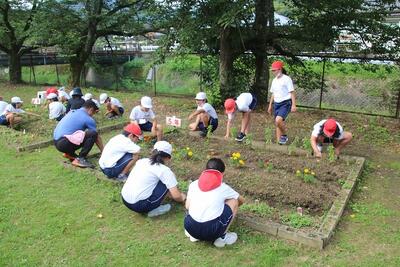 全校で学級園の整備を行いました。雑草を取り除き、腐葉土を入れてうねを作りました。ポーチュラカやマリーゴールドなどの花の苗を植えたり、ナスやキュウリ・ピーマンなどの夏野菜の苗を植えました。夏野菜が実ったら、給食の食材として利用する予定です。みんなで大切に育てていきます。