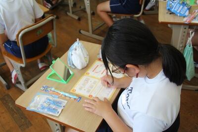 6月は、「歯を大切にしよう月間」です。先日のやまびこの集い(児童集会)では、すこやか委員会が「よくかんで食べようクイズ」を行いました。この日は、5・6年生が「クラープコントロール」について養護教諭のI先生と学習しました。動画を見て磨き残しが多い部分や歯肉炎などについて考え、学習シートに記入しました。その後、鏡を見ながら歯磨きをしました。自分の健康について考え実践する力を身に付けています。