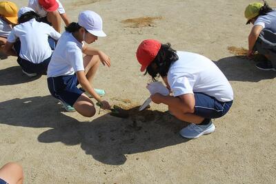 今年4月の東京都杉並区の小学校での事故を受けて、運動場の安全点検を全児童と全職員で行いました。移植ごてや草取りカマ・釘抜きなどを使って、運動場に打ってあるポイントとなる釘やフックの点検を行いました。本校は朝の活動で週に3回運動場を走っています。同じような事故が起きないように、一つ一つ丁寧に点検しました。安心安全な学校づくりを推進しています。